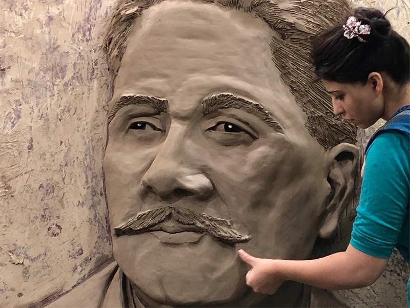 Clay relief mural sculpted in honour of Allama Iqbal. Hand modelled detailing captures his vision and iconic presence.