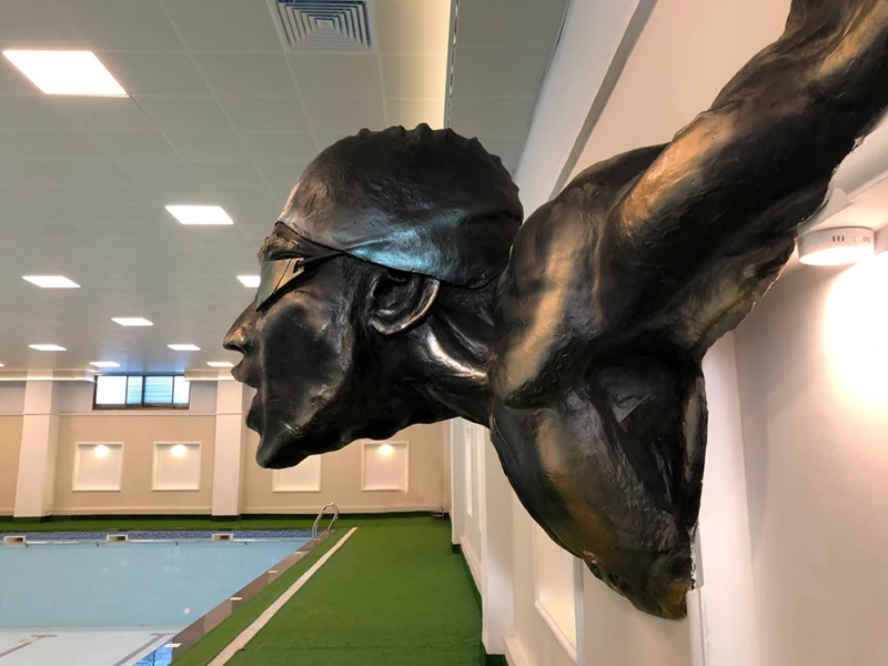 Fibreglass swimmer bursting through the wall. Captures power, motion, and the focus of elite athletic performance.